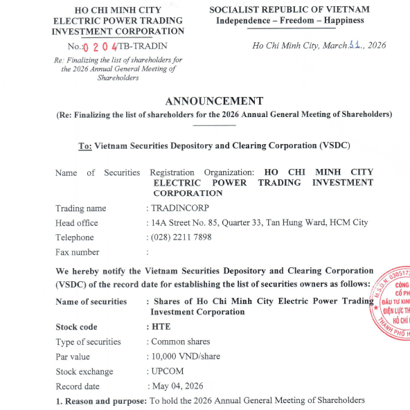 - Thông báo chốt danh sách đại hội cổ đông năm 2026 Ngày đăng: 01/04/2026